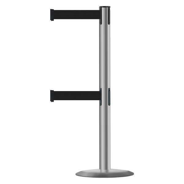 Barrier Post with Belt, Maximum Overall Height 38 in, Legend No Legend, Legend Color Not Applicable, Number of Belts 2, Belt Length 7 1/2 ft, Belt Width 2 in, Belt Color Black, Belt Pattern No Pattern, Post Color Gray, Product Type Stanchion, Minimum Overall Height Not Applicable, Post Diameter 2 1/2 in, Post Material Stainless Steel, Post Finish Polished Stainless Steel, Base Type Standard, Base Diameter 14 in, Base Material Cast Iron, Base Finish Polished Stainless Steel, ADA Compliance Yes