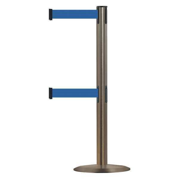 Barrier Post with Belt, Maximum Overall Height 38 in, Legend No Legend, Legend Color Not Applicable, Number of Belts 2, Belt Length 7 1/2 ft, Belt Width 2 in, Belt Color Blue, Belt Pattern No Pattern, Product Type Stanchion, Minimum Overall Height Not Applicable, Post Diameter 2 1/2 in, Post Material Metal Alloy, Post Finish Satin Stainless Steel, Base Type Standard, Base Diameter 14 in, Base Material Cast Iron, Base Finish Satin Stainless Steel, ADA Compliance Yes
