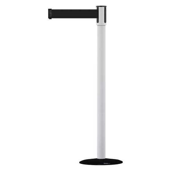 Barrier Post with Belt, Maximum Overall Height 38 in, Legend No Legend, Legend Color Not Applicable, Number of Belts 1, Belt Length 7 1/2 ft, Belt Width 2 in, Belt Color Black, Belt Pattern No Pattern, Post Color White, Product Type Stanchion, Minimum Overall Height Not Applicable, Post Diameter 2 in, Post Material Metal Alloy, Post Finish Powder Coated, Base Type Basic, Base Diameter 14 in, Base Material Cast Iron, Base Finish Black ABS No Scuff Cover, Base Color Black, ADA Compliance Yes