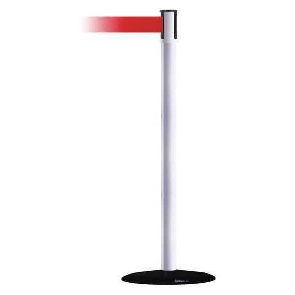 Barrier Post with Belt, Maximum Overall Height 38 in, Legend No Legend, Legend Color Not Applicable, Number of Belts 1, Belt Length 7 1/2 ft, Belt Width 2 in, Belt Color Red, Belt Pattern No Pattern, Post Color White, Product Type Stanchion, Minimum Overall Height Not Applicable, Post Diameter 2 in, Post Material Metal Alloy, Post Finish Powder Coated, Base Type Basic, Base Diameter 14 in, Base Material Cast Iron, Base Finish Black ABS No Scuff Cover, Base Color Black, ADA Compliance Yes