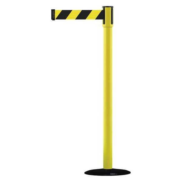 Barrier Post with Belt, Maximum Overall Height 38 in, Legend No Legend, Legend Color Not Applicable, Number of Belts 1, Belt Length 7 1/2 ft, Belt Width 2 in, Belt Color Black/Yellow, Belt Pattern Chevron, Post Color Yellow, Product Type Stanchion, Minimum Overall Height Not Applicable, Post Diameter 2 in, Post Material Metal Alloy, Post Finish Powder Coated, Base Type Basic, Base Diameter 14 in, Base Material Cast Iron, Base Finish Black ABS No Scuff Cover, Base Color Black, ADA Compliance Yes