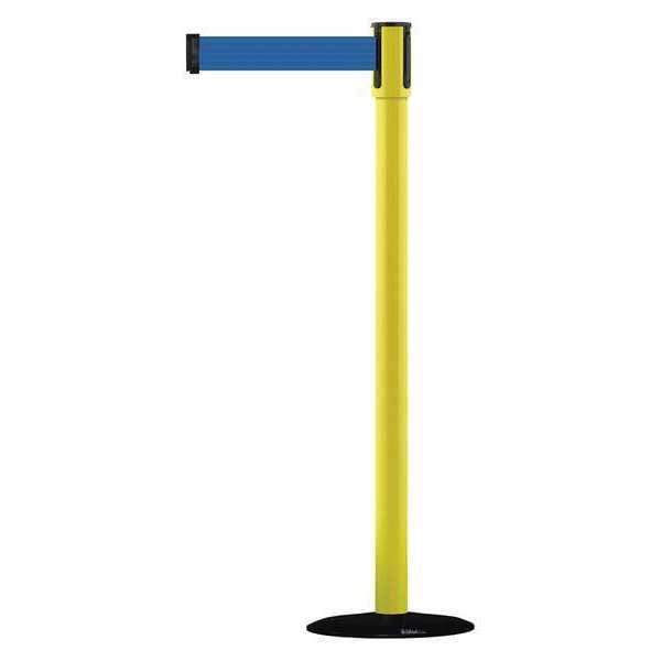 Barrier Post with Belt, Maximum Overall Height 38 in, Legend No Legend, Legend Color Not Applicable, Number of Belts 1, Belt Length 7 1/2 ft, Belt Width 2 in, Belt Color Blue, Belt Pattern No Pattern, Post Color Yellow, Product Type Stanchion, Minimum Overall Height Not Applicable, Post Diameter 2 in, Post Material Metal Alloy, Post Finish Powder Coated, Base Type Basic, Base Diameter 14 in, Base Material Cast Iron, Base Finish Black ABS No Scuff Cover, Base Color Black, ADA Compliance Yes
