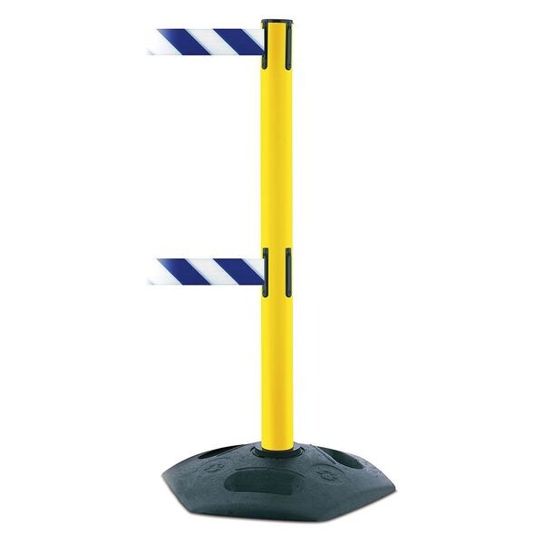 Barrier Post with Belt, Maximum Overall Height 38 in, Legend No Legend, Legend Color Not Applicable, Number of Belts 2, Belt Length 7 1/2 ft, Belt Width 2 in, Belt Color Blue, Belt Pattern Chevron, Post Color Yellow, Product Type Stanchion, Minimum Overall Height Not Applicable, Post Diameter 2 1/2 in, Post Material Plastic, Post Finish Powder Coated, Base Type Hexagonal, Base Configuration Detachable, Base Diameter 19 in, Base Material Rubber, Base Finish Black, Base Color Black