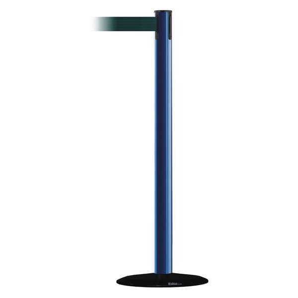 Barrier Post with Belt, Maximum Overall Height 38 in, Legend No Legend, Legend Color Not Applicable, Number of Belts 1, Belt Length 13 ft, Belt Width 2 in, Belt Color Green, Belt Pattern No Pattern, Post Color Blue, Product Type Stanchion, Minimum Overall Height Not Applicable, Post Diameter 2 1/2 in, Post Material Metal Alloy, Post Finish Powder Coated, Base Type Basic, Base Diameter 14 in, Base Material Cast Iron, Base Finish Black ABS No Scuff Cover, Base Color Black, ADA Compliance Yes