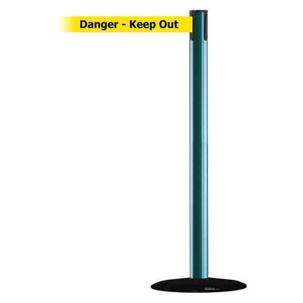 Barrier Post with Belt, Maximum Overall Height 38 in, Legend Danger Keep Out, Legend Color Black, Number of Belts 1, Belt Length 7 1/2 ft, Belt Width 2 in, Belt Color Yellow, Post Color Green, Product Type Stanchion, Minimum Overall Height Not Applicable, Post Diameter 2 1/2 in, Post Material Metal Alloy, Post Finish Powder Coated, Base Type Basic, Base Diameter 14 in, Base Material Cast Iron, Base Finish Black ABS No Scuff Cover, Base Color Black, ADA Compliance Yes