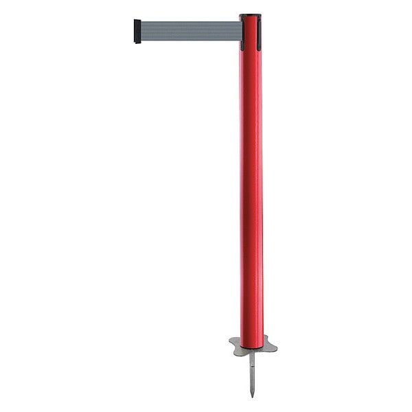 Barrier Post with Belt, Maximum Overall Height 36 in, Legend No Legend, Legend Color Not Applicable, Number of Belts 1, Belt Length 13 ft, Belt Width 2 in, Belt Color Gray, Belt Pattern No Pattern, Post Color Red, Product Type Post, Minimum Overall Height Not Applicable, Post Diameter 2 1/2 in, Post Material Plastic, Post Finish Powder Coated, Base Type Stake, Base Material Metal Alloy, Base Finish Unfinished, ADA Compliance No, Resistance Properties Wear Resistant