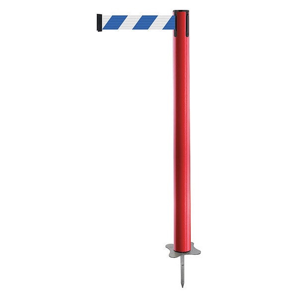 Barrier Post with Belt, Maximum Overall Height 36 in, Legend No Legend, Legend Color Not Applicable, Number of Belts 1, Belt Length 7 1/2 ft, Belt Width 2 in, Belt Color Blue, Belt Pattern Chevron, Post Color Red, Product Type Post, Minimum Overall Height Not Applicable, Post Diameter 2 1/2 in, Post Material Plastic, Post Finish Powder Coated, Base Type Stake, Base Material Metal Alloy, Base Finish Unfinished, ADA Compliance No, Resistance Properties Wear Resistant