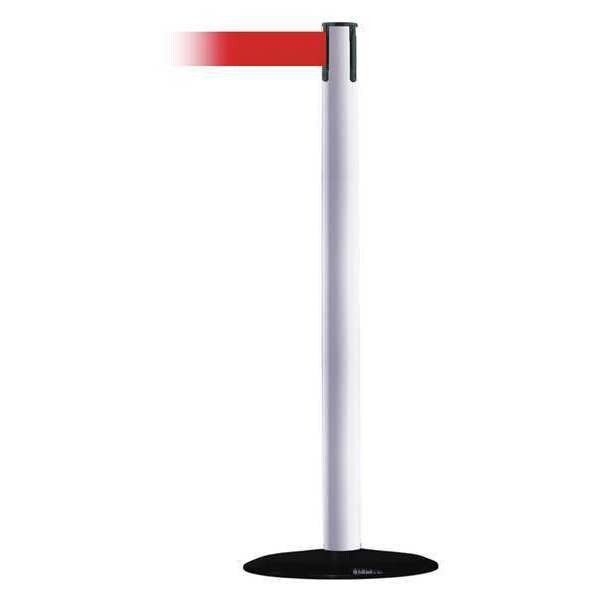 Barrier Post with Belt, Maximum Overall Height 38 in, Legend No Legend, Legend Color Not Applicable, Number of Belts 1, Belt Length 13 ft, Belt Width 2 in, Belt Color Red, Belt Pattern No Pattern, Post Color White, Product Type Stanchion, Minimum Overall Height Not Applicable, Post Diameter 2 1/2 in, Post Material Metal Alloy, Post Finish Powder Coated, Base Type Basic, Base Diameter 14 in, Base Material Cast Iron, Base Finish Black ABS No Scuff Cover, Base Color Black, ADA Compliance Yes