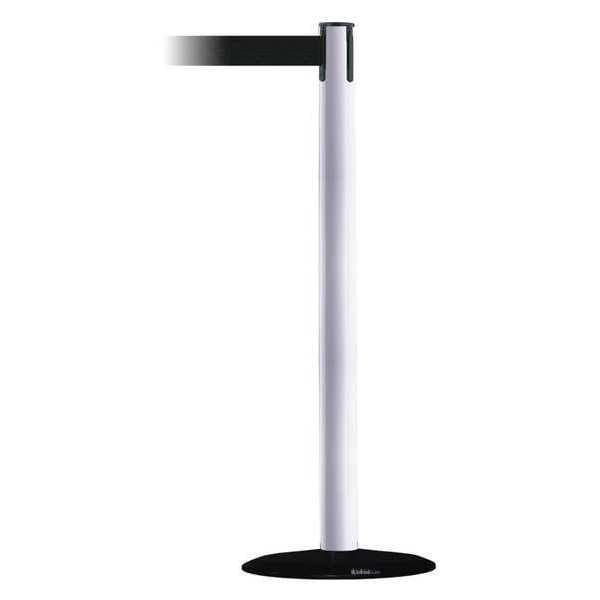 Barrier Post with Belt, Maximum Overall Height 38 in, Legend No Legend, Legend Color Not Applicable, Number of Belts 1, Belt Length 7 1/2 ft, Belt Width 2 in, Belt Color Black, Belt Pattern No Pattern, Post Color White, Product Type Stanchion, Minimum Overall Height Not Applicable, Post Diameter 2 1/2 in, Post Material Metal Alloy, Post Finish Powder Coated, Base Type Basic, Base Diameter 14 in, Base Material Cast Iron, Base Finish Black ABS No Scuff Cover, Base Color Black, ADA Compliance Yes