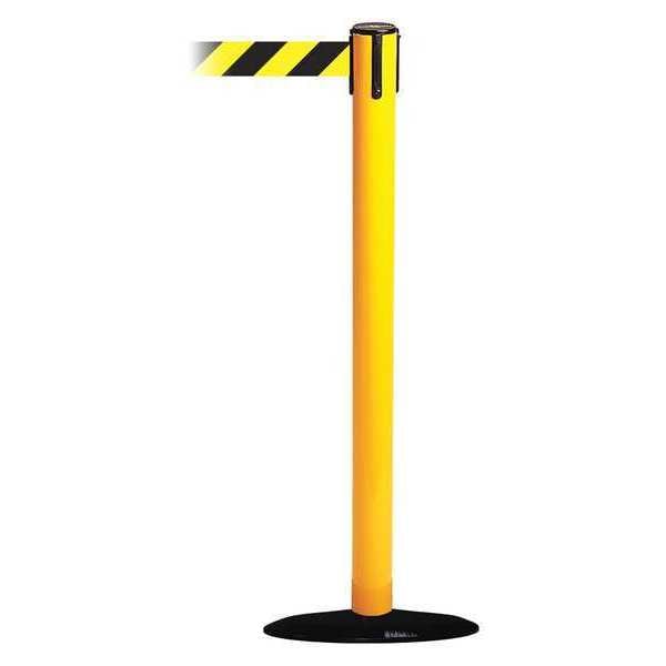 Barrier Post with Belt, Maximum Overall Height 38 in, Legend No Legend, Legend Color Not Applicable, Number of Belts 1, Belt Length 7 1/2 ft, Belt Width 2 in, Belt Color Black/Yellow, Belt Pattern Chevron, Post Color Yellow, Product Type Stanchion, Minimum Overall Height Not Applicable, Post Diameter 2 1/2 in, Post Material Metal Alloy, Post Finish Powder Coated, Base Type Basic, Base Diameter 14 in, Base Material Cast Iron, Base Finish Black ABS No Scuff Cover, Base Color Black