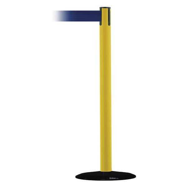 Barrier Post with Belt, Maximum Overall Height 38 in, Legend No Legend, Legend Color Not Applicable, Number of Belts 1, Belt Length 7 1/2 ft, Belt Width 2 in, Belt Color Blue, Belt Pattern No Pattern, Post Color Yellow, Product Type Stanchion, Minimum Overall Height Not Applicable, Post Diameter 2 1/2 in, Post Material Metal Alloy, Post Finish Powder Coated, Base Type Basic, Base Diameter 14 in, Base Material Cast Iron, Base Finish Black ABS No Scuff Cover, Base Color Black, ADA Compliance Yes