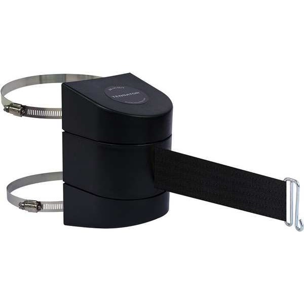 Retractable Belt Barrier, Mounting Style Hose Clamp Mounting Plate, Wire Clip, Belt Length 24 ft, Belt Color Black, Frame Color Black, Number of Belts 1, Includes Hose Clamp Fixing, Wire Clip Belt End, Includes Mounting Hardware Included