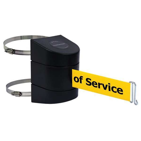 Retractable Belt Barrier, Mounting Style Hose Clamp Mounting Plate, Wire Clip, Belt Length 15 ft, Belt Color Yellow, Legend Out of Service, Legend Color Black, Frame Color Black, Number of Belts 1, Includes Hose Clamp Fixing, Wire Clip Belt End, Includes Mounting Hardware Included