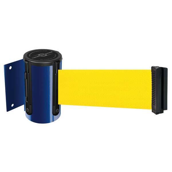 Retractable Belt Barrier, Belt Length 7 1/2 ft, Belt Color Yellow, Frame Color Blue, Number of Belts 1, Includes Receiving Clip, Includes Mounting Hardware Included