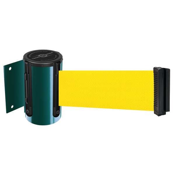 Retractable Belt Barrier, Belt Length 7 1/2 ft, Belt Color Yellow, Frame Color Green, Number of Belts 1, Includes Receiving Clip, Includes Mounting Hardware Included