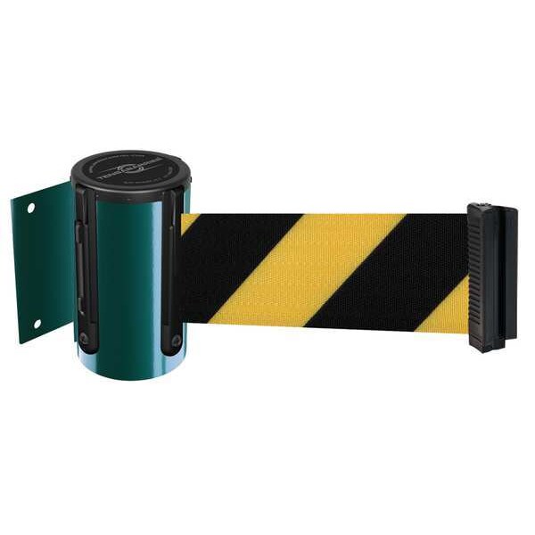 Retractable Belt Barrier, Belt Length 13 ft, Belt Color Black/Yellow, Belt Pattern Chevron, Frame Color Green, Number of Belts 1, Includes Receiving Clip, Includes Mounting Hardware Included
