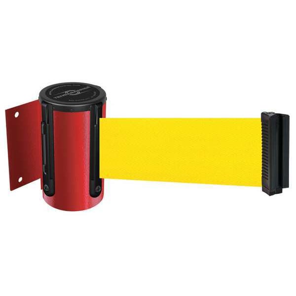 Retractable Belt Barrier, Belt Length 7 1/2 ft, Belt Color Yellow, Frame Color Red, Number of Belts 1, Includes Receiving Clip, Includes Mounting Hardware Included