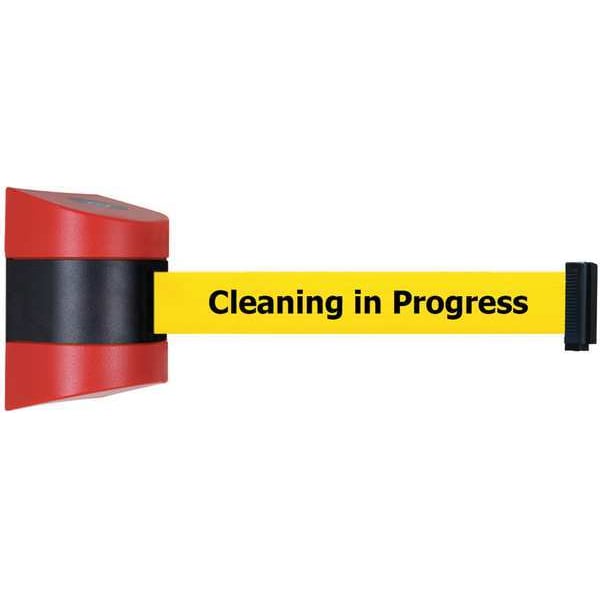 Retractable Belt Barrier, Belt Length 15 ft, Belt Color Yellow, Legend Cleaning in Progress, Legend Color Black, Frame Color Red, Number of Belts 1