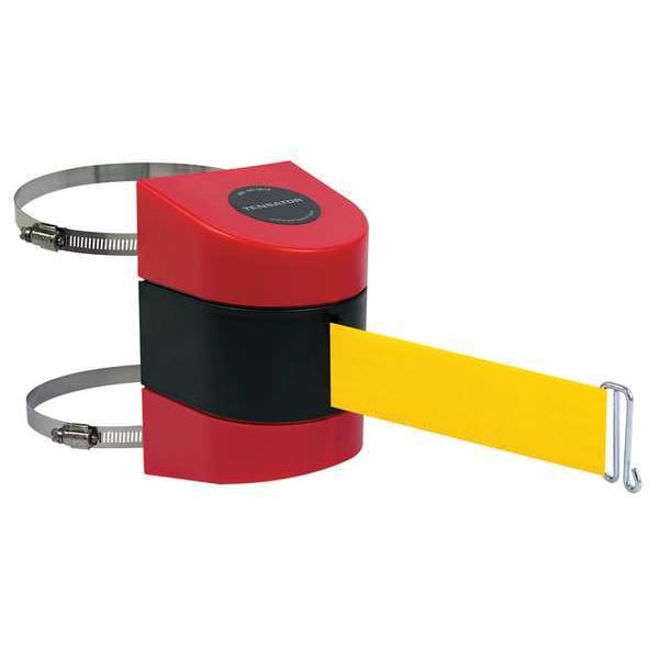 Retractable Belt Barrier, Mounting Style Hose Clamp Mounting Plate, Wire Clip, Belt Length 24 ft, Belt Color Yellow, Frame Color Red, Number of Belts 1, Includes Hose Clamp Fixing, Wire Clip Belt End, Includes Mounting Hardware Included