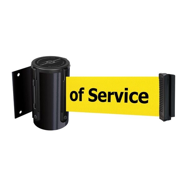 Retractable Belt Barrier, Mounting Style Fixed Mounting Plate, Belt Length 7 1/2 ft, Belt Width 2 in, Belt Color Yellow, Belt Pattern No Pattern, Legend Out of Service, Legend Color Black, Frame Color Black, Reflectivity Non-Reflective, Number of Belts 1