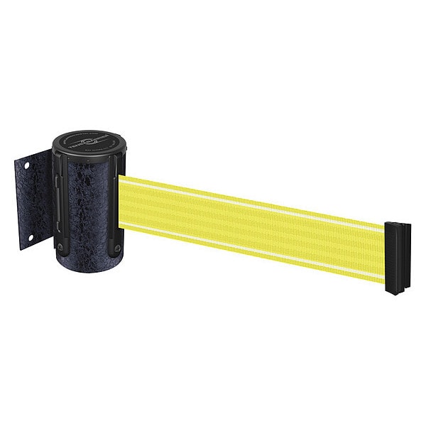 Retractable Belt Barrier, Mounting Style Wall, Belt Length 7 1/2 ft, Belt Color White/Yellow, Belt Pattern No Pattern, Legend No Legend, Legend Color Not Applicable, Frame Color Black, Overall Height 4 1/2 in, Number of Belts 1, Frame Finish Powder Coated, Includes Receiving End, Includes Mounting Hardware Included