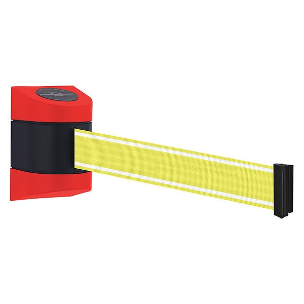 Retractable Belt Barrier, Mounting Style Wall, Belt Length 15 ft, Belt Color White/Yellow, Belt Pattern Horizontal Stripe, Legend No Legend, Legend Color Not Applicable, Frame Color Red, Overall Height 5 1/2 in, Number of Belts 1, Frame Finish Unfinished, Includes Receiving End, Includes Mounting Hardware Included