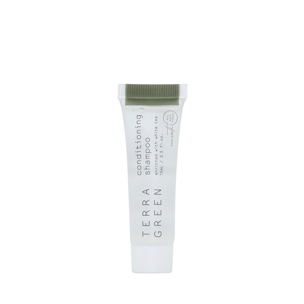 Terra Green is an elegant hotel amenity collection, balancing deep and generous hydration properties with a mild yet delightfully refreshing white tea fragrance boasting a bouquet of verdant botanical notes. Made with an eco-friendly formulation that does not contain any parabens or artificial colors, and is also cruelty-free. 0.5oz. 15ml conditioning shampoo tube with screw cap. 600/Case.