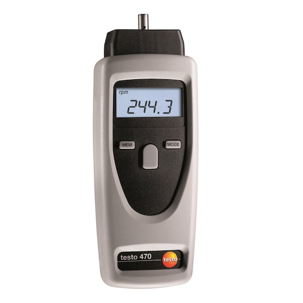 testo 470 tachometer with SoftCase, reflective markers, adapter, probe tip, wheels 0.1 m and 6, batteries, transport case, and calibration protocol