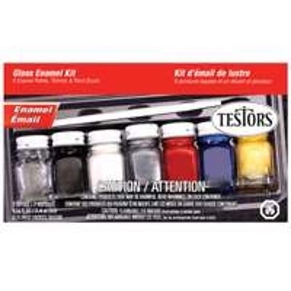 Kit includes thinner, paintbrush, tray and six colors: red, dark blue, yellow, white, silver, black.