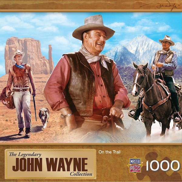 Classic John Wayne Movie Moments. Officially Licensed John Wayne Product. 1000 Piece Puzzle Finished 19. 25 in. x 26. 75 in. Thick recycled puzzle board and random cut pieces ensure a tight interlocking fit and create a fun experience. MasterPieces - An American Puzzle & Game Company.