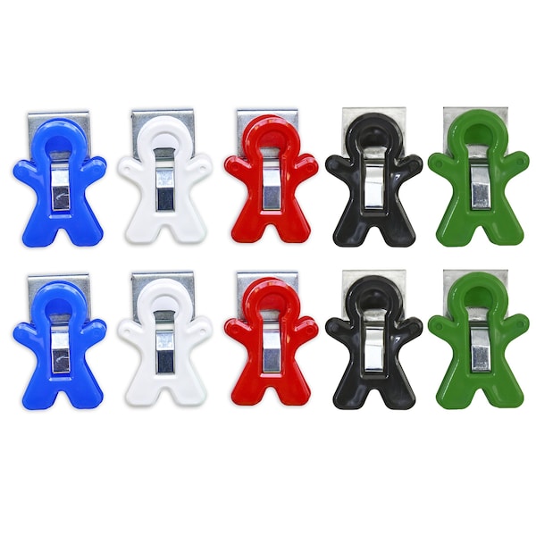 The strong magnet holds even heavy items easily and securely. Attach to filing cabinets, refrigerators and any other magnetic surface. Sturdy clip holds papers, notes, signs and more. Fun person-shape. Sold as a pack of 10 in assorted colors no color choice.