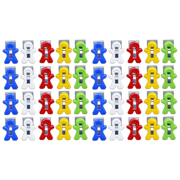 The strong magnet holds even heavy items easily and securely. Attach to filing cabinets, refrigerators and any other magnetic surface. Sturdy clip holds papers, notes, signs and more. Fun person-shape. Each bucket includes 40 magnets in assorted colors colors may vary.