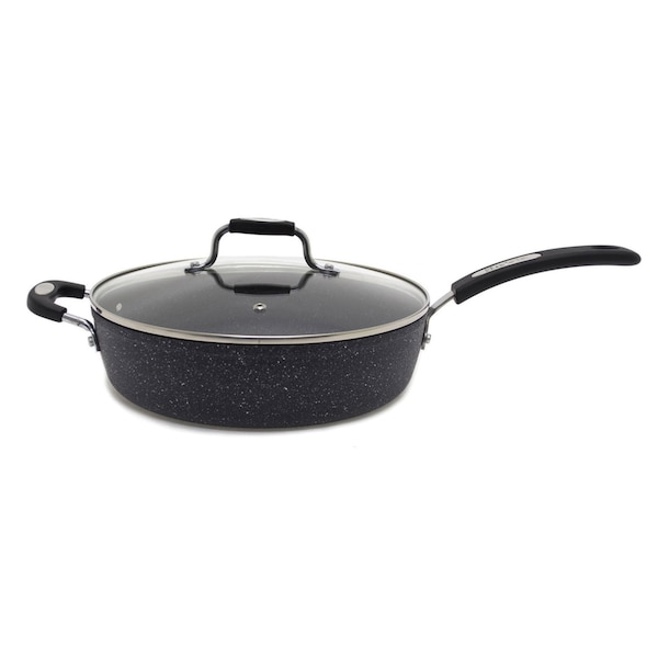 The Rock by Starfrit's Nonstick Deep Fry Pan's unique manufacturing process uses small metal pellet impact technology to modify the surface to form an ultra durable rock like finish. The result is an outstanding release performance' 3x better than traditional nonstick cookware. This 12-In. Deep Fry Pan is made with an extra-thick forged aluminum base for optimal heat distribution and even cooking. Its Bakelite handle is oven safe up to 350 deg.F' with or without the lid. This fry pan is ideal for large meals' 1 pot meals' or even cinnamon rolls for brunch! The pan is easy to clean and dishwasher safe.