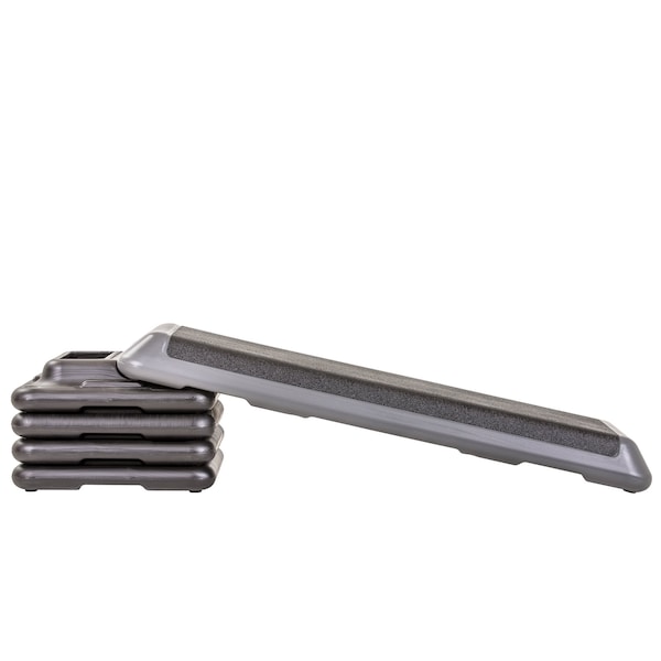 Achieve total-body fitness with The Step Club Size Aerobic Platform, the same step used in fitness clubs across the country. The Step is a great home-fitness tool for beginners to experts and is customizable for a variety of aerobic and strength exercises. This set includes a grey nonslip platform, 2 patented freestyle risers and 2 original risers to create the foundation of any workout program. The Club Size platform features one 1 stepping surface 43in L x 16in W x 4in H and four 4 risers 16in L x 16in W x 2in H. These sturdy risers can be used on any type of indoor flooring from carpet to concrete to hardwood without leaving behind scratches. The patented freestyle risers add variety to your workout with multiple slanted positions perfect for adding intensity to push-ups, sit-ups, lunges, and more. Burn more calories the higher you step with 4in to 6in to 8in platform height options using the risers. Each riser and platform is made with four nonskid feet to prevent sliding or moving during exercise. Both the platform and rises also feature a resistance band notch, which safely holds an optional resistance band in place. This set is crafted from durable, recyclable high-density polyethylene that supports up to 350 pounds or up to 500 lbs. with risers. This product is backed by a 90-day manufacturer's warranty period.