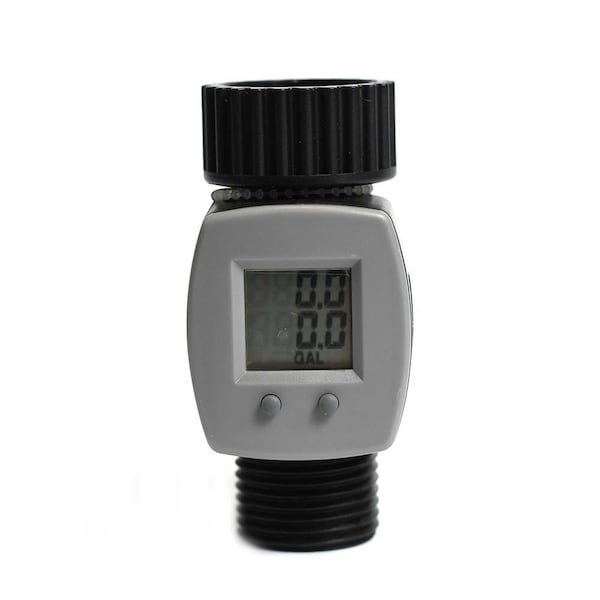 Thrifco Plumbing 8429975 Hose End Water Flow Meter 56854. Orbits Flow Meter measures the water used from your outdoor hose faucet. Adjust your water consumption based on the measurements to prevent over watering, saving you money. The meter calculates both single-use and total water consumption. Perfect for measuring how much water it takes to fill up your pool or water the plants in your garden. Choose to display the amount of water used in gallons or liters.consumption. Displays usage in gallons or liters letting you know just how much water is being used. For outdoor use with cold water only.