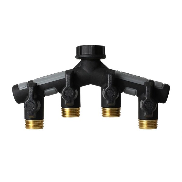 Thrifco Plumbing 8429970 Metal Manifold with Shut-offs 58970. This metal hose faucet manifold converts your faucet into a 4-faucet hose connection. Convenient valve controls let you adjust the flow, or shut-off each connection individually. The 3/4 male-threaded connection has a brass swivel head with comfort grip for easy installation. Heavy-duty construction with leak-free ball valves ensures quality performance.