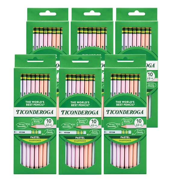 Ticonderoga has a tradition of fine quality writing instruments in the US for over 100 years. The exclusive graphite core features a proprietary formula focusing on graphite mined from carefully controlled sources to deliver extra smooth performance. Top-quality latex-free erasers remove marks completely without smudging. Premium wood harvested from responsibly managed sources provides smooth, even sharpening with minimal breakage. Teachers prefer Ticonderoga for its dependability and craftmanship. When only the best will do, choose Ticonderoga brand pencils. Each pack includes 10 pencils in 5 assorted colors. Sold as 6 packs for a total of 60 pencils.