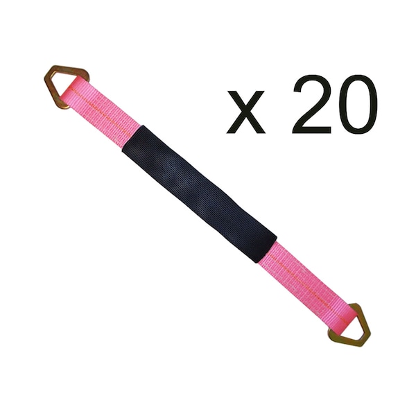21" HD Axle Strap w/ Abrasive w/ Delta Ring. Qty: 20 pcs HD Axle Strap w/ Abrasive w/ Delta Ring Size: 2" Length: 21" Breaking Strength: 10,000 lbs. Working Load Limit: 3,333 lbs. Webbing Strength: 12,000 lbs Webbing Material: Polyester Tie Down Webbing Color: Pink