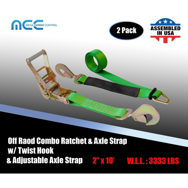 Axle Ratchet Tie Down Strap w/ Snap Hook Race Car Hauler Trailer Flatbed Green, 2PK