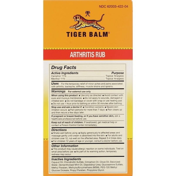 Tiger Balm Arthritis Rub comes in a pump bottle making it an easy and convenient choice for people with arthritic hands. Temporary relief from joint pain associated with arthritis backache stiffness muscle strains and spasms. Tiger Balms powerful pain relief in a lotion for easy absorption with added Chondroitin and Glucosamine.