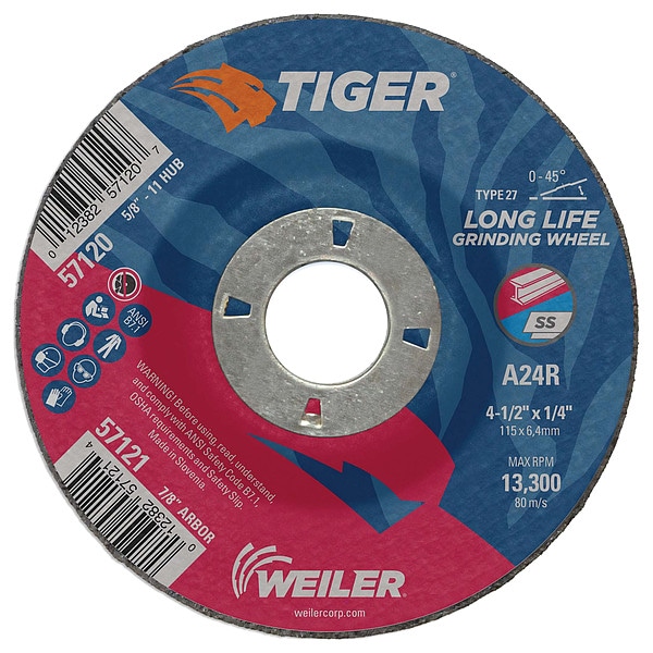 Grinding Wheel, Type 27, 4 1/2 in Dia, 0.25 in Thick, 7/8 in Arbor Hole Size, Aluminum Oxide