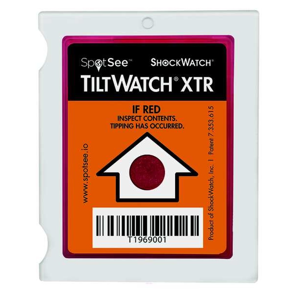 Tilt Indicating Label, Environmental Indicator Type Tilt, Tilt Indicator Type Tilt Indicator, Resettable Not Resettable, Label Width 1 11/16 in, Label Height 2 1/4 in, Temperature Range -10 Degrees to 90 Degrees C, Angle Sensitivity 80 Degrees , Adhesive Material Acrylic, Shelf Life 2 yr, Status When Shipped Armable, Language English, Package Quantity 100