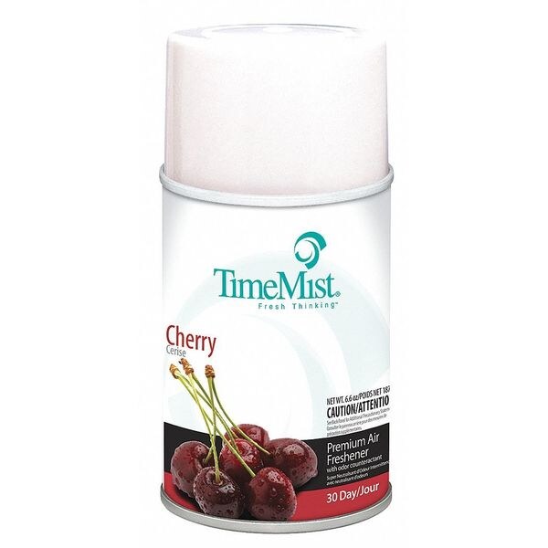 Metered Air Freshener Refill, Liquid, Fragrance Cherry, Aerosol Spray, 5.3 oz, Product Series TimeMist, Refill Life 30 day, Coverage 6,000 cu ft, Colorless, Compatible Mfg. Model Number 32-0555TM, 32-1131TM, 32-1141TM, VOC Content 0 Percent, Length 2 3/4 in, Width 2 3/4 in, Height 5 1/2 in, OSHA, Net Weight 0.55 lb, Package Quantity 12
