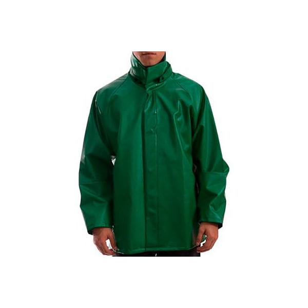 The safetyflex flame resistant specialty pvc on polyester jacket combines tough protection and comfortable fit. Made to resist industrial acids, chemicals, and caustics, safetyflex is engineered for protection. full cut shoulder with 90 sleeve to body angle for maximum freedom of movement. tapered sleeves have elastic inner cuffs for added safety. storm fly front seals out wind, rain and contaminants. non-conductive, non-corrosive snaps. hidden hardware for added protection. throat guard. High jacket collar with hook & loop closure for splash and drip protection. mildew resistant. heavy exterior coating for excellent permeation performance. soft, supple feel for all day comfort. distinctive safety green color for easy identification. detachable hoodsnaps are affixed to a collar flange and do not penetrate the garment. Detachable hood sold separately. flame resistant tested. Self extinguishing with flameout and afterglow less than or equal to 2 seconds after removal of ignition source and char length less than 6 inches. Test method astm d6413. ideal applications: chemical handling, transport and storage, petrochemical drilling, refineries, and environmental clean up. chemical resistance: many acids, oils, alcohols, salts and alkalies.
