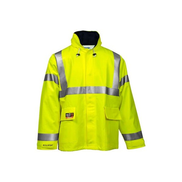 Tingley eclipse hi-visibility fr hooded jacket, zipper, fluorescent yellow/green, 2xl features: jacket with attached hood ansi/isea 107 class 3 compliant for flame resistance and high visibility conforms to astm f1891 for arc thermal performance and nfpa 70e - hrc 2 conforms to astm f2733 for flash fire performance fluorescent yellow-green background for excellent daytime visibility 2" silver reflective tape reflects light for 360 nighttime conspicuity overhead shoulder design for complete freedom of movement therm-o-rad sealed seams zipper/storm fly front with snap closure and hidden hardware flame resistant corduroy collar with roll-a-way hood oversized 3 piece hood with adjustable hook & loop take-up strap non-conductive, non-corrosive hardware full-vented cape back d-ring access for fall protection harness hook & loop take-up straps on wrists adjustable elastic drawcord flame resistant. Self extinguishing with flameout and afterglow less than or equal to 2 seconds after removal of ignition source and char length less than 6 inches. Test method astm d6413
