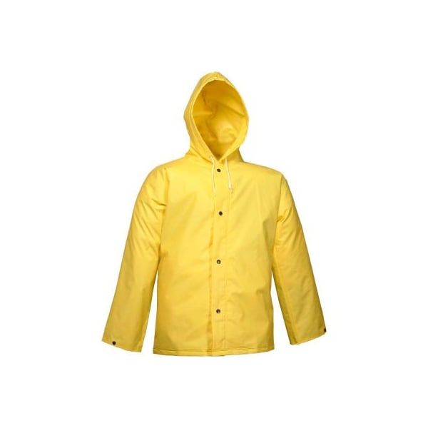 Tingley j56107 durascrim storm fly front hooded jacket, yellow, 4xl durascrim high strength, low cost. Double coated pvc on polyester suit offers durability at an economy price. Extremely high tear strength is the result of an open weave polyester scrim fabric being sandwiched between two layers of flame resistant pvc coating. Ideal applications: light chemical, construction, utilities, agriculture, food processing, and general industry. Chemical resistance: many acids, oils, alcohols, salts and alkalies.