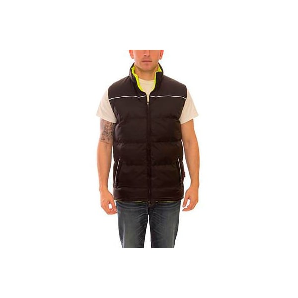 A one of a kind reversible puffy vest, can be used in the field and off. features: fluorescent yellow-green background material for excellent daytime visibility. 150d polyester on polyurethane. black ripstop 210t nylon on polyurethane. ansi 107 type r class 2 compliant. 2 inch silver reflective tape reflects light for 360 nighttime conspicuity. zipper front closure. 2 handwarmer pockets on each side. 270g quilted lining provides warmth and comfort. dark color helps conceal dirt while reflective piping enhances visibility. tapered back cut for added protection. attachment point for use as a liner with a sync system shell. product ships on hangers.