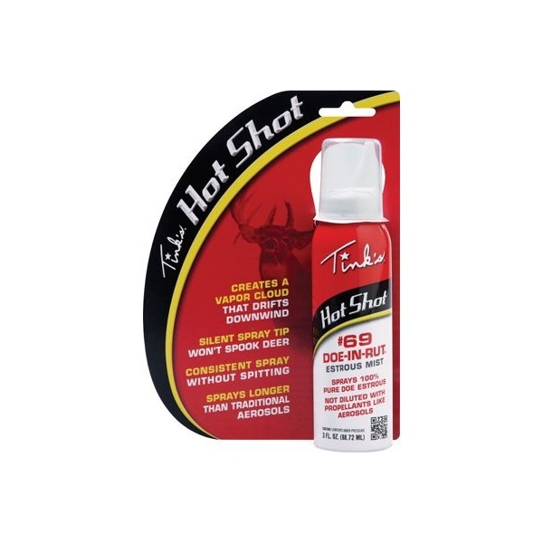 Tinks Hot Shot 3 OZ #69 Doe-In-Rut Buck Lure Mist An Innovative Method Of Scent Dispersal That Shoots Out A Super Fine Mist To Allow For Maximum Scent Dispersion With Hang Tag.
