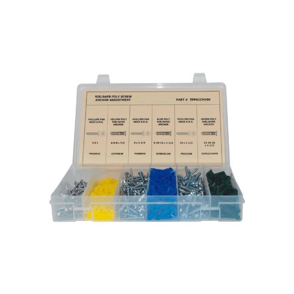 contents: apd66032 (100 pcs) - 6 x 1" combo pan head sms zinc ccm46828 (100 pcs) - 4-6-8 x 7/8" yellow poly rib/wing anchor apd88040 (100 pcs) - 8 x 1-1/4" combo pan head sms zinc ccm8101240 (100 pcs) - 8-10-12 x 1-1/4" blue poly rib/wing anchor apd21048 (50 pcs) - 12 x 1-1/2" combo pan head sms zinc ccm12141648 (50 pcs) - 12-14-16 x 1-1/2" green poly rib/wing