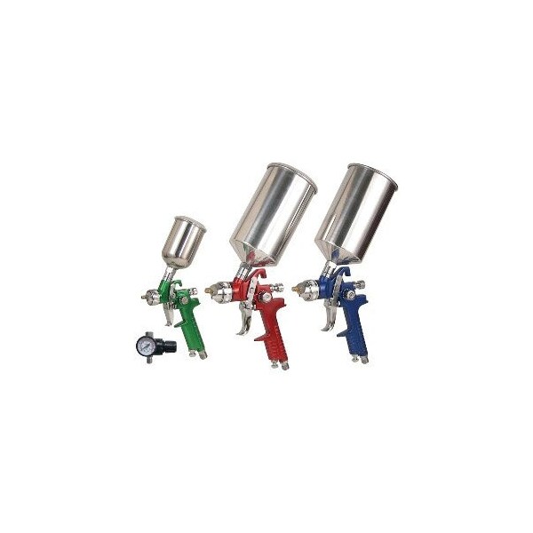 -Green Gun - 1.0 mm nozzle set for lighter materials and touch up work. -Red Gun - 1.4mm nozzle set for lighter materials. -Blue Gun - 1.7mm nozzle set for heavier materials. -Locking pressure regulator with gauge. -Bonus aluminum storage/carr